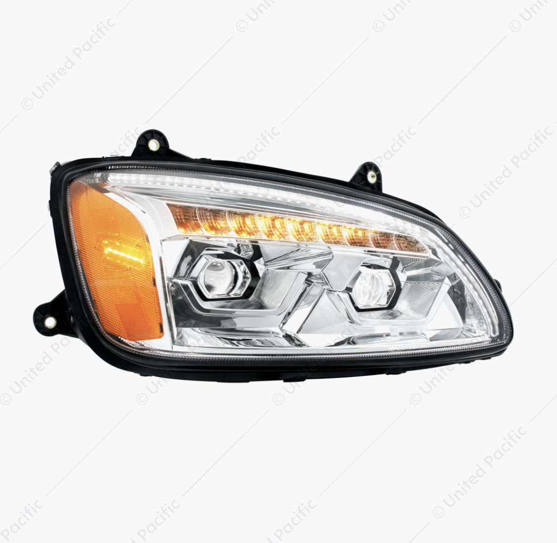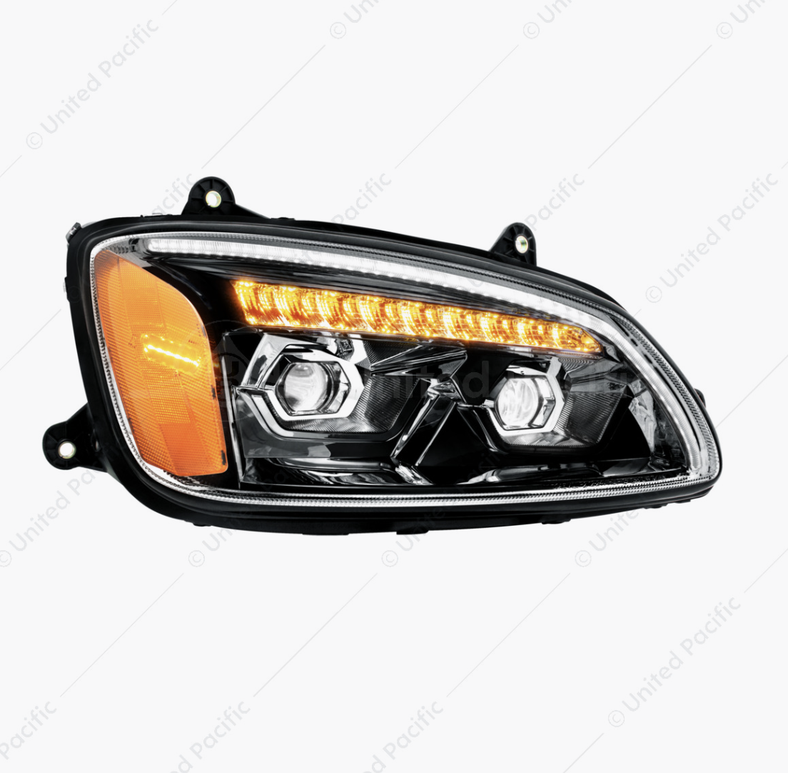 - High power projector headlight assembly with unique position light bar design.